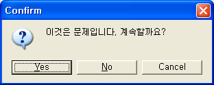 if( MessageDlg ("이것은 문제입니다. 계속할까요?" ,mtConfirmation,TMsgDlgButtons() << mbYes << mbNo << mbCancel,0) == mrYes )