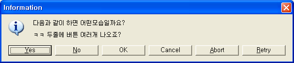 MessageDlg("다음과 같이 하면 어떤모습일까요? \r\r\nㅋㅋ 두줄에 버튼 여러개 나오죠?",mtInformation,TMsgDlgButtons()<<mbYes<< mbNo<< mbOK<< mbCancel<< mbAbort<< mbRetry,0);