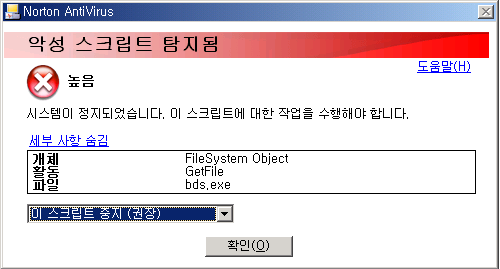BDS2006을 처음 시작하는데 악성스크립트 발견 메시지가...